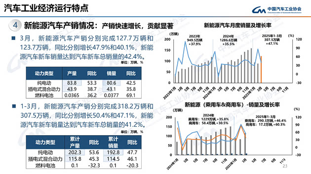 3月,新能源汽车产销分别完成127.7万辆和123.7万辆,环比分别增长43.9%和38.7%,同比分别增长47.9%和40.1%,新能源汽车新车销量达到汽车新车总销量的42.4%。在新能源汽车主要品种中,与上月相比,三大类新能源汽车品种产销均呈不同程度增长;与上年同期相比,三大类新能源汽车品种产销均呈现快速增长。
