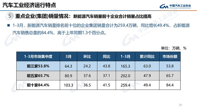 1-3月,汽车销量排名前十位的企业(集团)共销售630.2万辆,占汽车销售总量的84.4%。在汽车销量排名前十位企业中,与上年同期相比,东风公司、广汽集团和长城汽车销量呈不同程度下降,其他企业销量均呈不同程度增长,其中比亚迪股份和吉利控股增速更为显著。