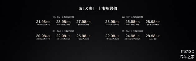 4月9日,比亚迪划时代旗舰 汉L唐L正式上市,共推出汉L EV、汉L DM、唐L EV、唐L DM四大车系。其中,汉L长宽高分别为5050*1960*1505mm,轴距2970mm,是标准的C+级轿车;唐L长宽高分别为5040*1996*1760mm,轴距2950mm,是标准的C+级SUV。汉L唐L分别推出6大配置版本,售价为20.98万~28.98万元。