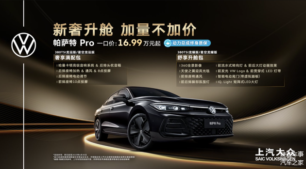 在B级车市场, 帕萨特可谓是销量“常青树”。今年一季度其卖出了63,396万辆,稳坐合资B级车销冠宝座。4月10日,上汽大众又增加了这款销量担当的产品矩阵,新增了帕萨特Pro 300TSI龙耀版/星空龙耀版,并且推出一口价16.99万元。