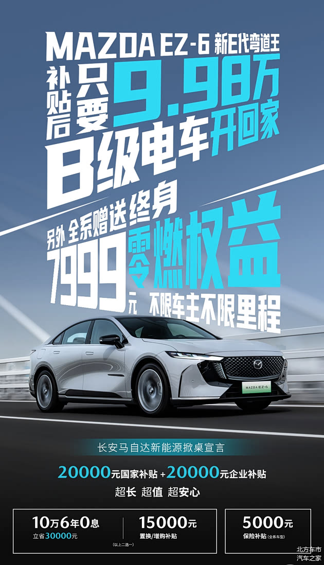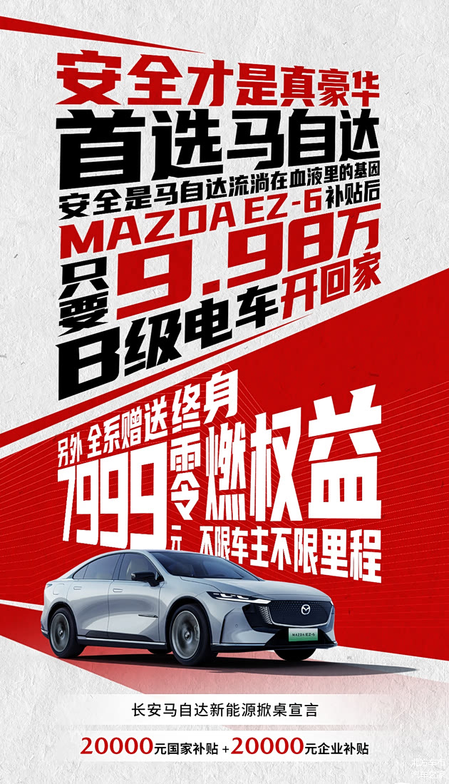 在新能源市场普遍强调“冰箱彩电大沙发”的背景下,MAZDA EZ-6以“安全”为核心卖点,全系赠送价值7999元的终身零燃权益,不限车主、不限里程,彻底消除用户对电池安全的顾虑。