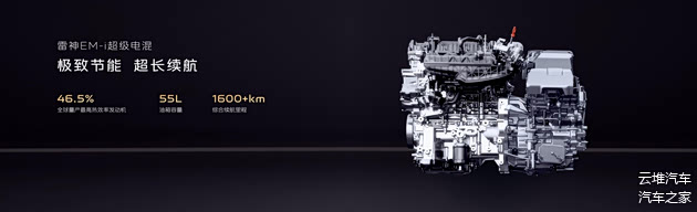 雷神EM-i版:搭载1.5L混动专用发动机(热效率46.5%)+E-DHT 11合1电驱系统,综合功率257kW,综合扭矩398N·m,CLTC馈电油耗3.36L/100km,综合续航1600km。