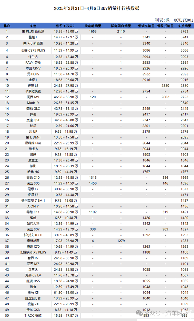2025 年 3 月 31 日 - 4 月 6 日 SUV 销量排行榜数据全面展示了该时间段内 SUV 市场各车型的销售情况。从数据中可以看出,不同品牌和类型的 SUV 销量差异明显。宋 PLUS 新能源以 3763 辆的成绩位居榜首,其在纯电动和插电混合领域均有不错表现,纯电动销量达 1653 辆,插电混合销量为 2110 辆,这表明消费者对新能源 SUV 的接受度不断提高,同时也反映出比亚迪在新能源技术和产品布局上的优势。星越 L 以 3741 辆的燃油车销量紧随其后,显示出传统燃油 SUV 在市场中仍有一定的需求和竞争力。