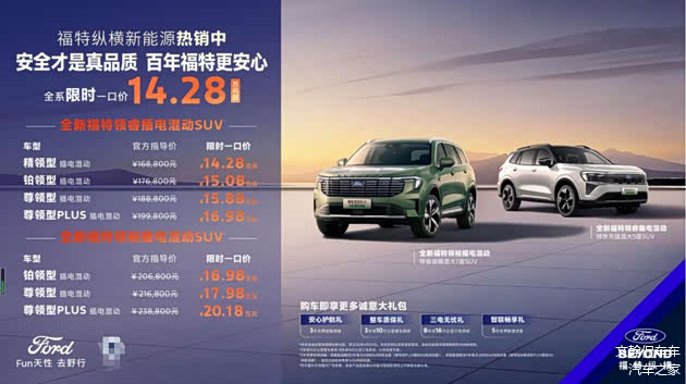 现在,为了让更多消费者能够体验到福特纵横插混SUV的魅力,福特推出了限时“一口价”活动。从即日起至2025年4月30日,购买全新福特领睿/领裕插电混动SUV,即可享受最低14.28万元起的超值价格。这个价格,相比同级别车型来说,性价比极高。而且,购车用户还能享受多重权益,如3年免费道路救援、3年或10万公里整车质保、8年或16万公里三电质保等,真正做到购车无忧、用车安心。