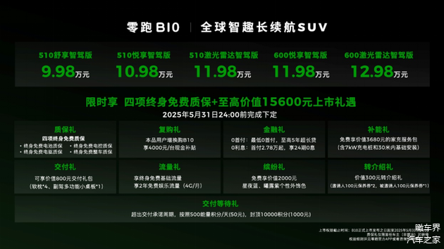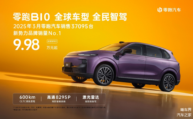 4月10日,零跑汽车推出全新B系列首款全球化车型—— 零跑B10,共5款车型,提供510km和600km两种CLTC续航版本,售价区间为9.98万至12.98万元。作为紧凑型SUV,零跑B10入门版续航达500公里,高配车型搭载激光雷达与高通双旗舰芯片,价格进入11万级,并支持OTA免费升级。同时,提供电池、电驱、电控及整车四项终身质保,真正实现“科技平权”。