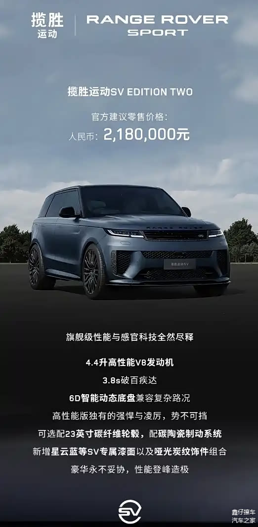 近日,2025款路虎揽胜运动版SV车型宣布正式上市,厂商建议零售价为218万元。新车定位于揽胜运动系列的旗舰产品,在性能与配置层面做出多项升级,动力系统采用4.4T V8双涡轮增压发动机,并配合48V轻度混合动力系统,官方数据显示,其0-100km/h加速时间为3.8秒。