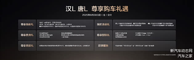 伴随汉L唐L的上市,比亚迪王朝网还准备了七重购车礼遇。截至6月30日24:00前完成购车开票,用户可享尊享金融礼,0首付、0利息任选其一;尊享置换礼,置换补贴至高35000元;还有尊享无忧礼、尊享贵宾礼、尊享智联礼、延保服务可选。