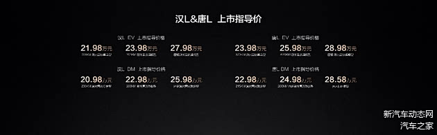 4月9日,比亚迪划时代旗舰 汉L唐L正式上市,共推出汉L EV、汉L DM、唐L EV、唐L DM四大车系。其中,汉L长宽高分别为5050*1960*1505mm,轴距2970mm,是标准的C+级轿车;唐L长宽高分别为5040*1996*1760mm,轴距2950mm,是标准的C+级SUV。汉L唐L分别推出6大配置版本,售价为20.98万~28.98万元。