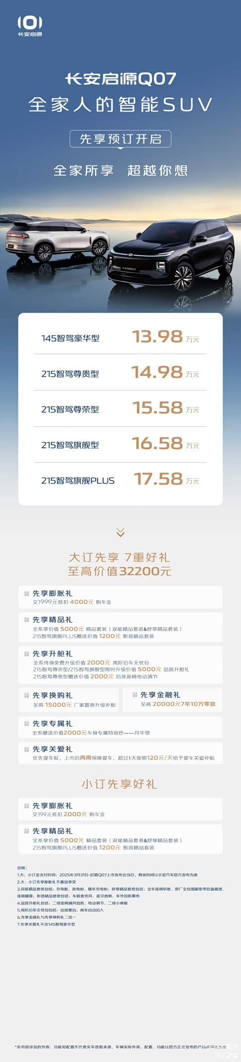 为用户坚定打造“越级价值,降维供给”的产品,做中高阶智能普及者,让广大家庭用实在价格,开上顶级智能好车,这是长安启源的初心。为兑现这份的承诺,长安启源Q07不玩花招,在先享预订阶段就已将福利拉满。