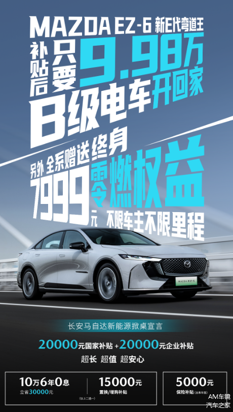 同时为了让大家更轻松地得到这台高品质的全球车型,马自达EZ-6近期推出了诸多优惠政策和补贴政策。全系可享至高40000元补贴,包括至高20000元置换国补+15000元置换/增购厂补+5000元保险补贴,同时送出价值7,999元不限车主、不限里程终身零燃权益,帮助大家解除后顾之忧。综合算下来,补贴后马自达EZ-6仅9.98万元起售。