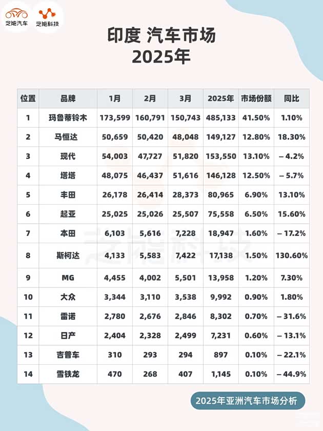 ◎ 玛鲁蒂铃木:销量150,743辆,同比下降1.3%,市场份额从41.5%降至39.1%,仍稳居第一。◎ 现代:销量51,820辆,同比下降2.2%,市场份额13.4%,重回第二。◎ 塔塔:销量51,616辆,同比增长3.0%,市场份额13.4%,排名升至第三。◎ 马恒达:销量48,048辆,同比增长18.3%,市场份额12.5%,排名第四。◎ 丰田:销量28,373辆,同比增长13.0%,市场份额7.4%。◎ 起亚:销量25,507辆,同比增长19.2%,市场份额6.6%。◎ 斯柯达:销量7,422辆,同比增长164.9%,市场份额1.9%,创历史新高,排名第七。◎ 名爵(MG):销量5,501辆,同比增长18.4%,市场份额1.4%,位列第九。◎ 本田(+2.2%)、大众(+0.3%)表现平稳,而雷诺(-32.6%)、日产(-7.5%)等则出现下滑。