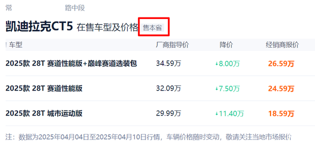 因为 凯迪拉克CT5 2025款的终端门店实际售价可以更低,目前的城市运动版显示最低门槛价为18万级;或许统计数据中包括二级渠道的成交价,当然也是以分期为前提的价格,可是相较于21.59万元的售价还是值得去看一看的。并且客观上有些区域的门店没有太多附加条件,只是要求分期,价格也来到了18.59万元起;参考下图数据,这是江苏某门店于四月份在线上公布的价格方案。