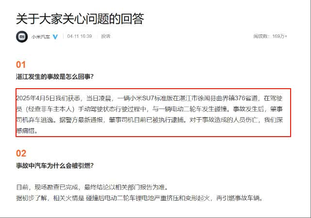 【小米回应湛江事故致2人死亡事件,非车主本人开车,车辆初步判断是被引燃?】日前徐闻警方披露了2025年4月5日凌晨5时许发生的小米SU7标准版与电动二轮车发生碰撞后起火事件,小米汽车也进行了回应。 小米汽车表示,事发车辆的驾驶员并非车主本人,起火原因初步了解并非车辆自燃,而是被“引燃”。 对此,车圈老司机蓝湛认为,小米SU7又又出事儿了?而且每次事故都引发了不小的关注,看来流量确实是把双刃剑,但根源还是如何提升行车安全意识及车辆自身的安全性,至于是引燃还是怎么“燃”起来的,就得需要相关部门给出权威调查结果了,希望这次不要石沉大海。