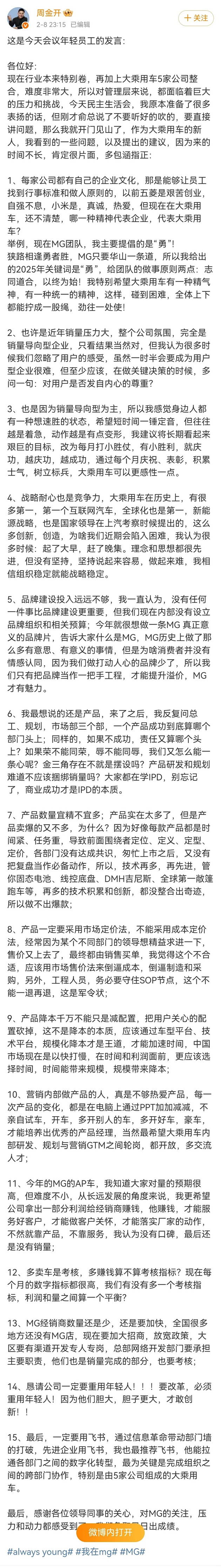 事实上,调任MG品牌后,周钘依然坚持本色,今年2月,他在微博上写了2000字长文,把自己到上汽乘用车后,所感受到的欠缺之处公之于众。