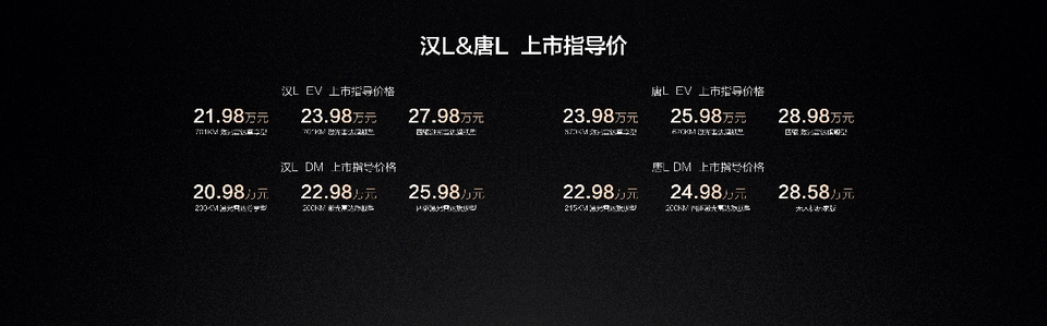 2025年4月9日,比亚迪汉L唐L正式上市,分别推出了6大配置版本,售价为20.98万~28.98万元。