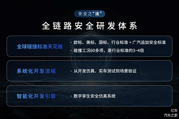 广汽全链路安全研发体系包含行业天花板级的碰撞安全标准,从开发仿真、实车测试到场景验证的系统化开发流程,以及数字孪生安全仿真系统等智能化开发引擎。其中,广汽的碰撞标准在欧标、美标、国标及行业内所有最高标准的基础上,细化追加了更严格的要求,工况高达60多种,是行业标准工况数量的3-4倍。