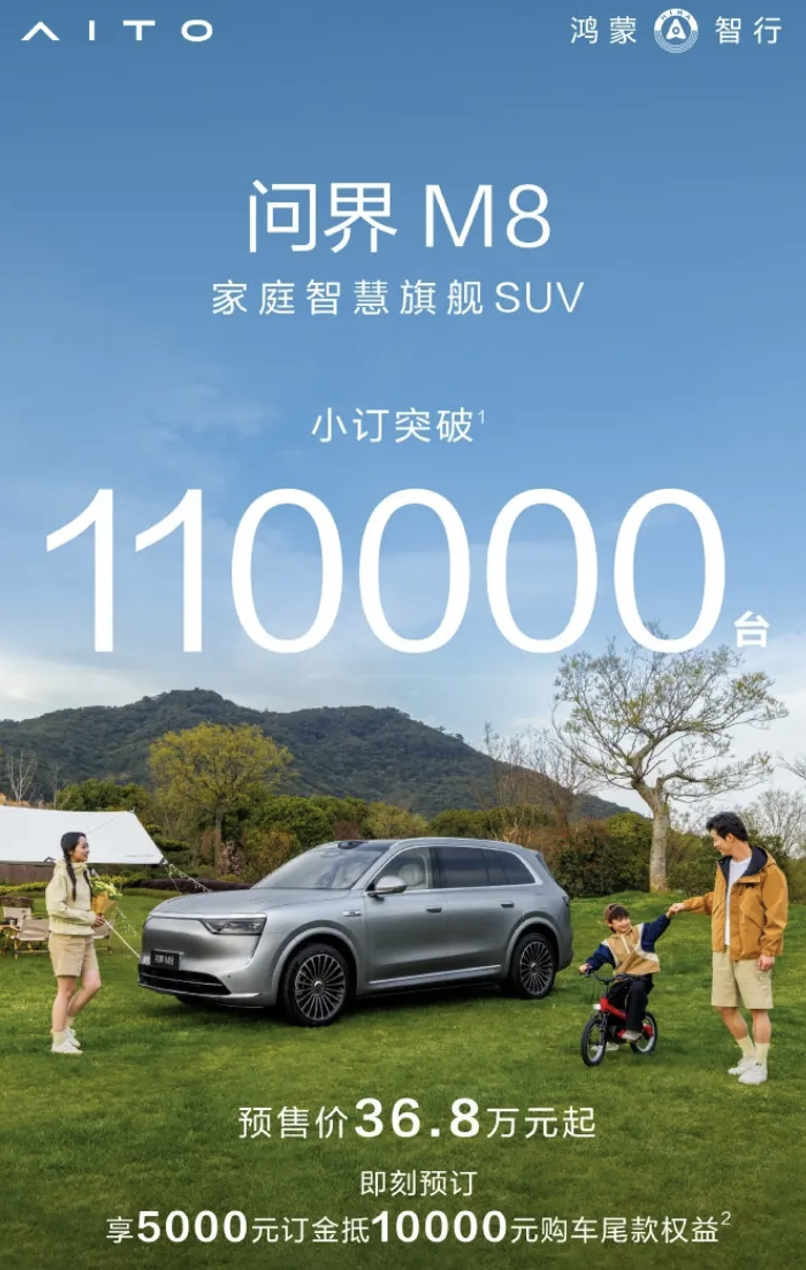 【订单数据真夸张 问界M8小订突破11万台】看来问界M8要带着十几万的小订数据来开发布会了。目前这台车的小订都已经突破了11万,是非常夸张的。看来鸿蒙智行的用户还真是不差钱。如今买车就像买菜一样轻松。目前下订问界M8可以享受5000定金抵1万的尾款,预售价格区间在368000到458000。相对于问界M9车长只少了40毫米,而且同样使用1.5T增程器,匹配前后双电机,像投影大灯、电动门、后排激光投影一样不少,这样的外观动力加上配置可以说是一台问界M9的青春版了。其他品牌主打的冰箱、彩电、大沙发,这辆车一样不少,而且还有着华为智驾加持,这台车在同级车型中还真是独一无二的存在。目前的问界M9已经是同级别的销量冠军,像这台M8的销量肯定也差不了。接下来就看正式售价公布之后,小订转大订的比例会有多少了。