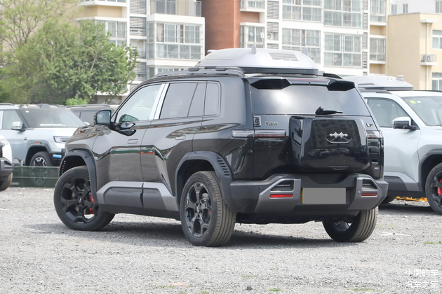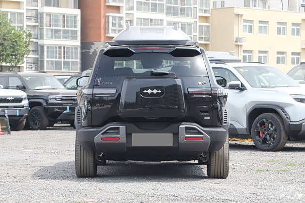 车尾部分,新车带有外挂式“小书包”,它并非是备胎而是一个小型的储物空间,容积是28L,装饰作用大于实用,在“书包”的两侧是横向布局的双线切割尾灯组,两点后具有不错的辨识度,狂野的后保险杠的造型与车头相呼应,其离去角达到了28°。