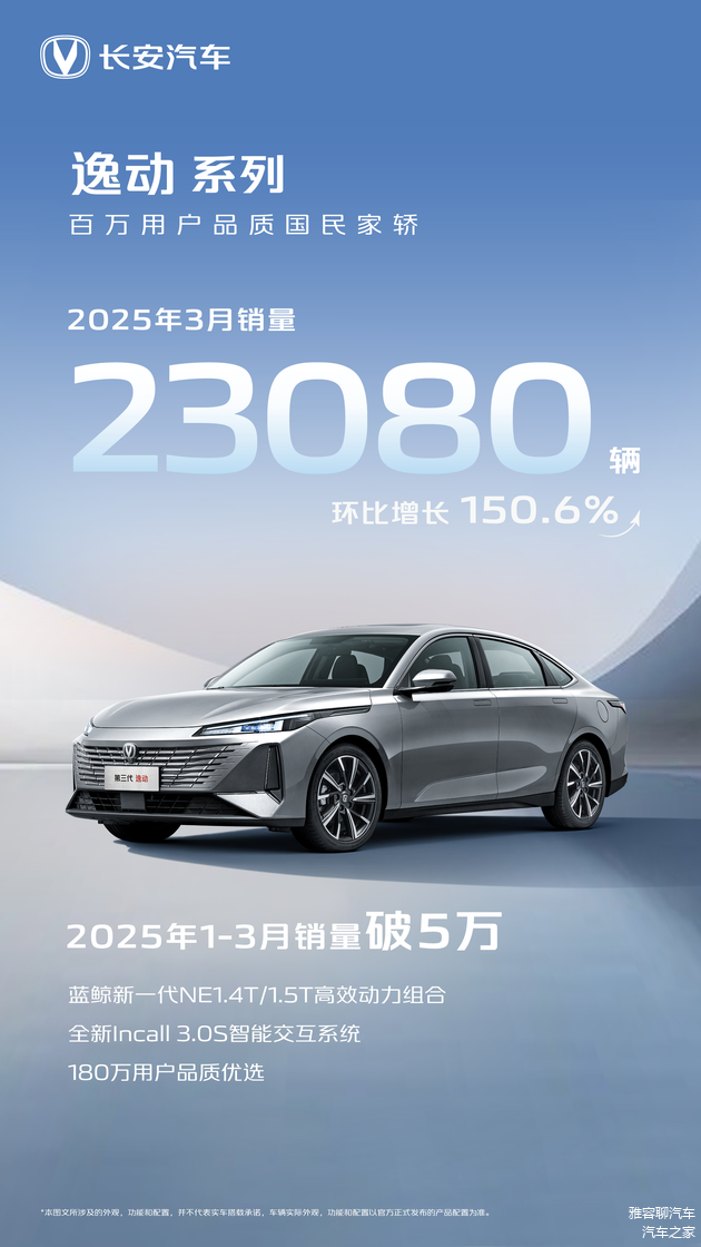 2025年一开年,紧凑型轿车圈就被长安第三代逸动的热销刷屏了。数据显示,2025年一季度,第三代逸动销量持续攀升,3月单月销量突破2.3万辆,环比增幅超150%,一季度累计销量突破5.66万辆,以数据印证国民家轿的硬核竞争力。