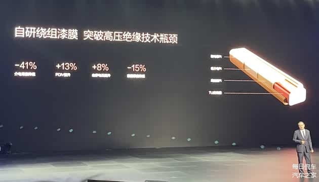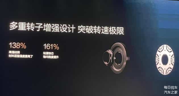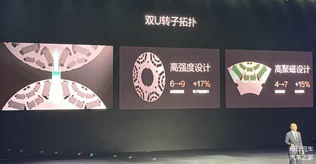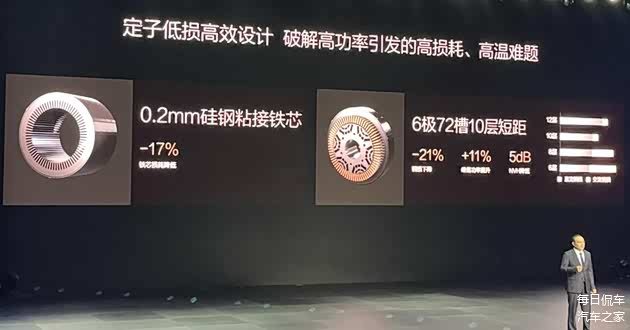 这台电机采用高强硅钢转子,采用多重转子增强设计和粘接铁芯结构,将材料的屈服强度提升了138%,轴向刚度提升161%。采用双U型的磁铁排布和N50EH高能积分段磁铁,将磁性能提升18%,涡流损耗降低了44%。定子也采用了很多低损耗设计,如0.2mm硅钢粘接铁芯,将铁芯损耗降低17%。采用6极72槽10层短距绕组,让铜损降低21%。绕组线圈上增加新研制的漆膜,突破了高压绝缘技术的瓶颈。