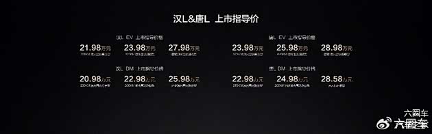4月9日,比亚迪划时代旗舰 汉L唐L正式上市,共推出汉L EV、汉L DM、唐L EV、唐L DM四大车系。其中,汉L长宽高分别为5050*1960*1505mm,轴距2970mm,是标准的C+级轿车;唐L长宽高分别为5040*1996*1760mm,轴距2950mm,是标准的C+级SUV。汉L唐L分别推出6大配置版本,售价为20.98万~28.98万元。