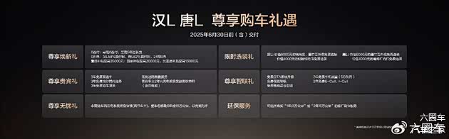 伴随汉L唐L的上市,比亚迪王朝网还准备了七重购车礼遇。截至6月30日24:00前完成购车开票,用户可享尊享金融礼,0首付、0利息任选其一;尊享置换礼,置换补贴至高35000元;还有尊享无忧礼、尊享贵宾礼、尊享智联礼、延保服务可选。