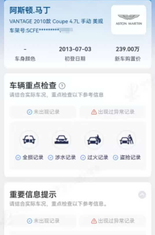 前段时间鉴定了一台阿斯顿马丁V8 Vantage,2013年7月上牌,跑了3万多公里,二手挂价35.80万。