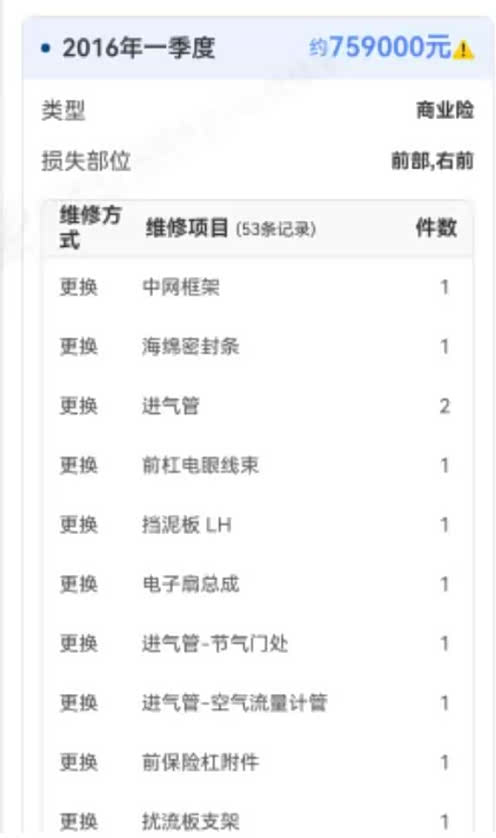 看看它的车险记录,2015年1季度16万,2015年三季度29万,2016年一季度76万,这是每次都发生了很大的事故吗?