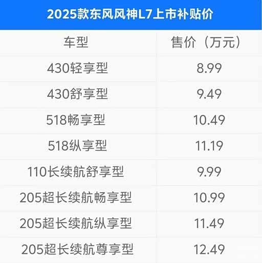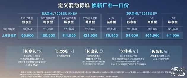 2025年4月13日,东风风神L7年度改款车型正式上市,共推出8款车型,指导价区间为9.49万-13.99万元,补贴后售价下探至8.99万-12.49万元。作为紧凑型新能源SUV市场的“性价比卷王”,新款L7在配置、智能座舱及动力系统上全面升级,纯电版新增430km续航版本,插混版则搭载马赫电混系统,CLTC综合续航突破1500km,直指比亚迪元PLUS、吉利银河星舰7等竞品,剑指10万级新能源SUV市场。
