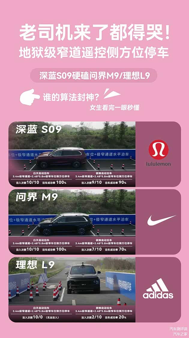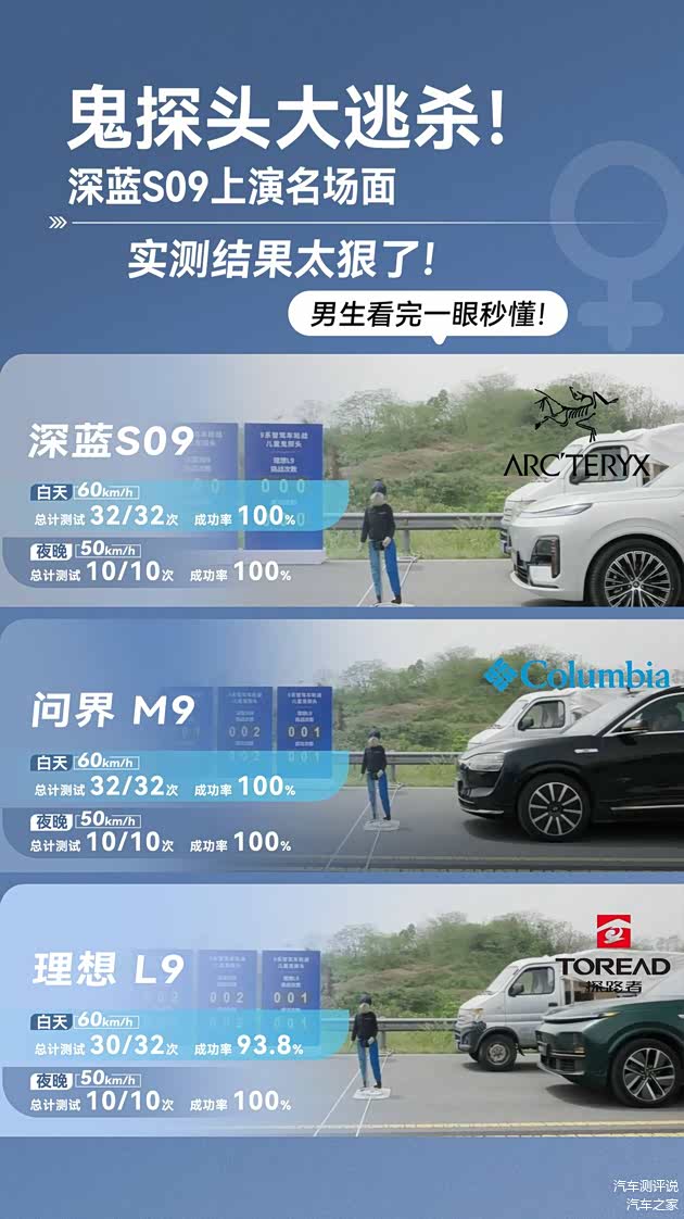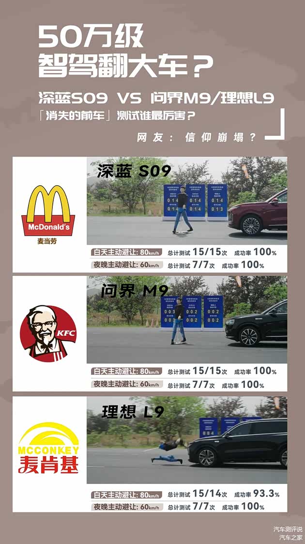 4月12日至4月13日,汽车之家联合多位汽车行业媒体达人,对 深蓝S09、问界M9和理想L9开展了一场为期两天的深度智驾测试,测试项目包括“儿童鬼探头”、高速故障车、消失的前车、自动泊车四个高难度、复杂场景的实测。