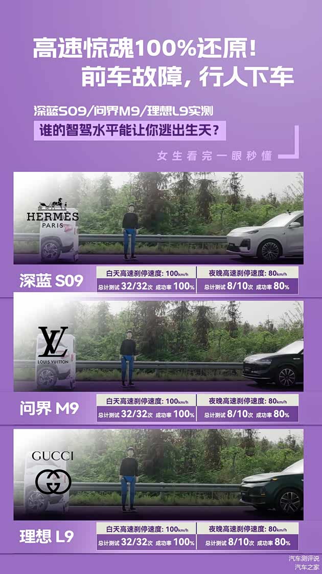 高速故障车的避让测试,深蓝S09和问界M9、理想L9的表现则不分伯仲,在白天的32次测试中,三车在100km/h的高速运行下,避让成功率都为100%。而夜晚的测试成绩略低,三车在80km/h的速度下,避让成功率都为80%,10次测试中三款车型皆出现2次失误。