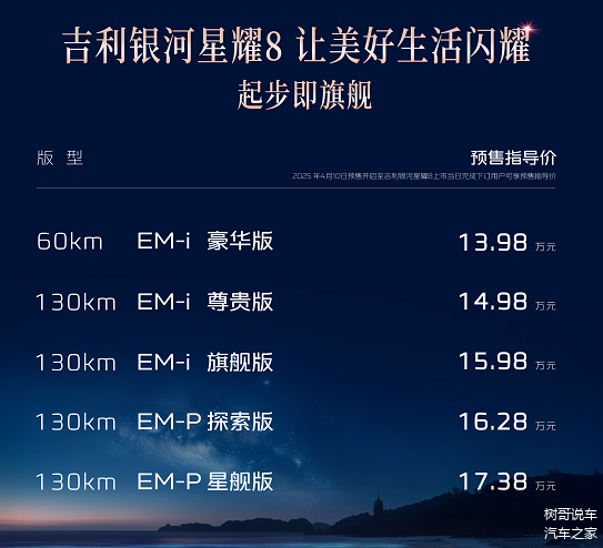4月10日,吉利银河星耀8正式开启预售,以13.98万元起的“震撼级”定价和“5米车长、3升油耗、6秒加速、1600公里续航”的全能表现,迅速成为新能源市场焦点。这款定位“全球新一代豪华中大型电混轿车”的车型,凭借“高质优价”策略,直击合资品牌与传统豪华品牌的腹地,展现出对中高端市场的强烈冲击力。