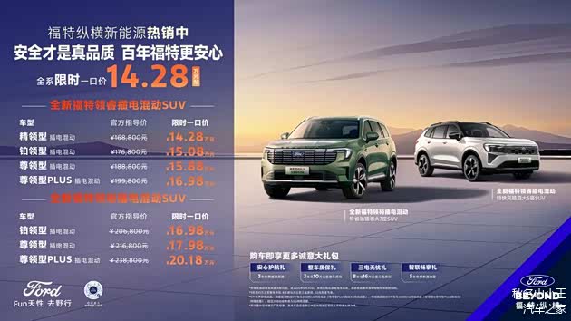 从即日起到4月30日,购买福特领睿或领裕插电混动SUV,不用比价,不用砍价,全系直降,14.28万元起。这不是套路价,也不是“起售价”诱饵,而是真正有诚意的限时让利。更关键的是,这波优惠不减配!哪怕是搭载L2.9级高阶智驾的车型,也一样享受“一口价”政策,妥妥的真香定律。