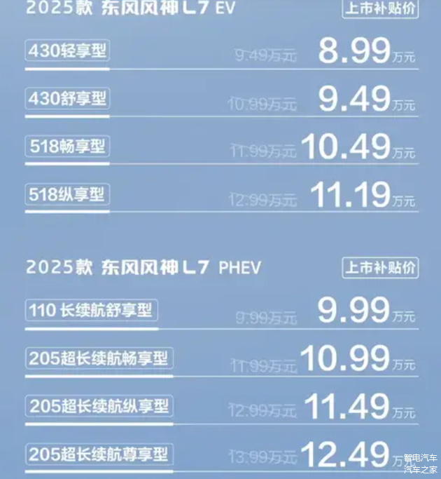2025款东风风神L7共推出8款车型,指导价区间为9.49-13.99万元,补贴后售价区间为8.99-12.49万元。从配置上来看,插混版车型更推荐205超长续航尊享型,补贴后价格为12.49万元,配置上看齐了目前行业的主流水平,无论是智能化配置,还是舒适性配置,都足够满足日常的使用。