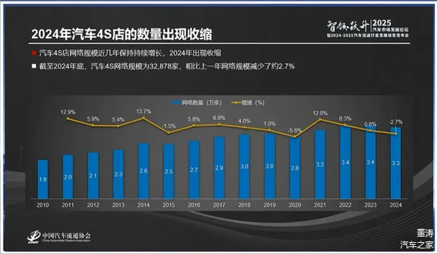 中国汽车流通协会发布了《中国汽车流通行业发展报告(2024-2025)》,截至2024年底,全国汽车4S店网络规模为3.29万家,相比上一年减少2.7%,近四年来首次出现缩量情况。分能源形式来看,去年退网的4,419家4S店中,93%为传统燃油车品牌;从品牌来看,自主品牌约占65%,合资品牌约29%,豪华品牌约6%。中国汽车流通协会副秘书长郎学红表示,“去年汽车市场的价格战较为激烈,渠道端同城同品牌间的竞争也随之增强,部分门店在竞争中被淘汰,所以4S店总量在减少。”