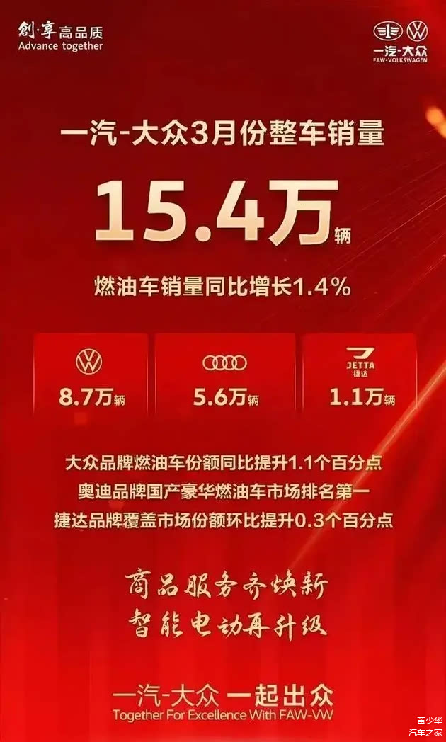 市场表现印证了一汽-大众战略转型的成效。今年3月,一汽-大众全品牌销量达15.4万辆,同比增长9.5%。其中,大众品牌销售8.7万辆,同比增长14.08%,展现出强劲的市场竞争力。特别是在中高级轿车市场,迈腾3月销量同比增长27.9%,继续领跑细分市场。