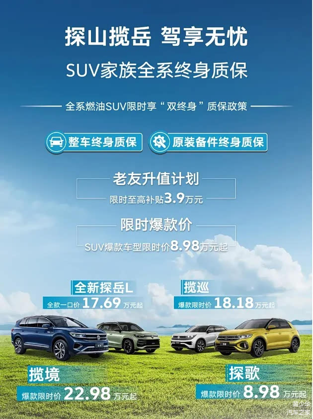 在此基础上,4月12日,一汽-大众再次重磅推出全系燃油SUV“双终身”质保政策,自2025年4月12日(含)起至2025年5月15日(含),凡在一汽-大众大众品牌经销商处购买一汽-大众全系燃油SUV车型的客户,均可享“双终身”质保政策,即整车终身质保+原装备件终身质保,覆盖发动机、变速箱、底盘等十大核心系统,终身保障不受年限、里程限制,全国联保。除了率先宣布整车终身质保的揽境、揽巡,此次政策还覆盖了全新探岳L、探岳众享款、探岳、探岳X及探歌等燃油SUV车型。