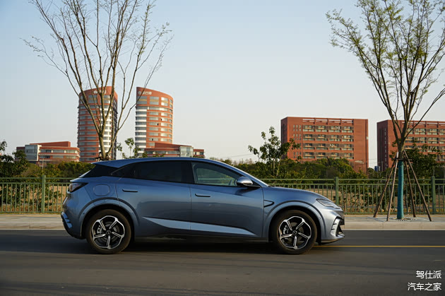 那么,既然是两厢车,侧面必然是重头戏。线条从低矮的车头开始往后延伸。车顶弧线从A柱滑向C柱的姿势,活像顺滑的山脊突然被隔断,硬生生把轿跑的优雅截成了“断背山”,字面意义上的。明明比亚迪的两厢车不多,或者说之前的都不够好看,但06GT的设计师显然深谙两厢车的设计美学,所有的线条都往后方扬起,营造一种速度的快感并且再一次放大06GT的臀部。