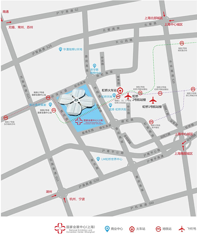 地铁:乘坐地铁 10 号线至虹桥 2 号航站楼站换乘地铁 2 号线至国家会展中心站