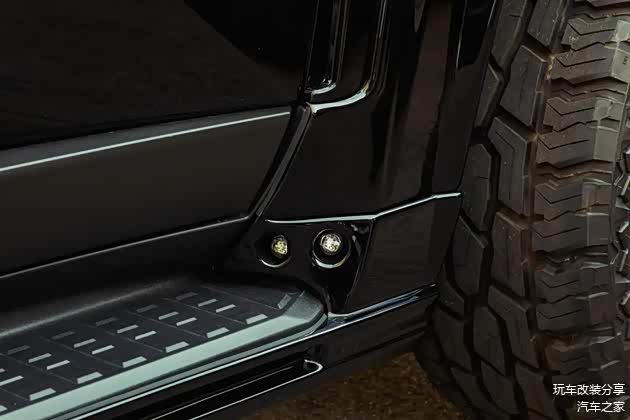 轮眉进行宽体处理,可以容纳更大的负值轮毂和越野轮胎。侧面有金属侧踏板,同样也加入了LED灯照明。