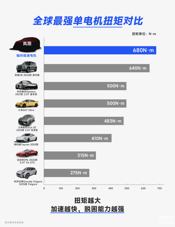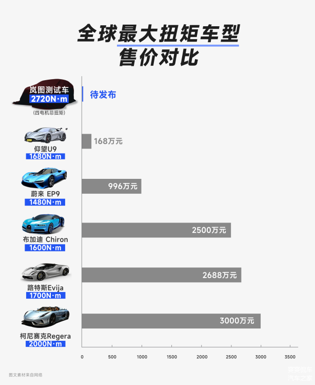 因此,拥有2000N·m的柯尼赛克Regera零百公里加速仅需2.8秒,路特斯Evija零百加速同样低于3秒。搭载全球最大扭矩电机的岚图测试车零百加速或将达到千万超跑级,跻身“3秒俱乐部”。