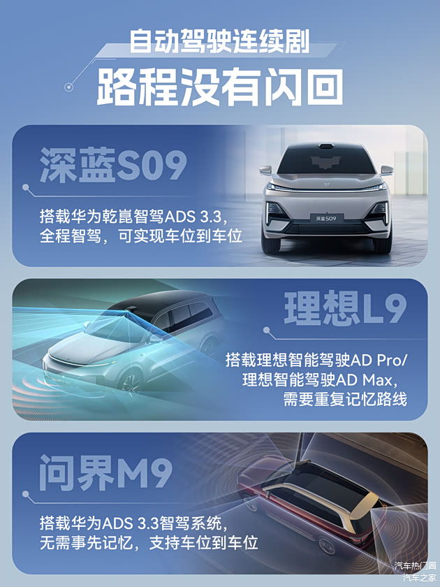 预估价30-35万的 深蓝S09 凭借搭载华为乾崑智驾ADS 3.3的先进技术,感知力大幅度提高。其搭载的 192 线激光雷达,为行业量产最高线数。250 米的超远探测距离,相较上一代提升 20%,让车辆能提前洞悉远方路况。184 万点 / 秒的最高点频,赋予它超高清的 “视力”,能清晰还原物理世界,精准识别较小目标。20Hz 超高雷达扫描频率,极大提升对加塞车辆、鬼探头行为的预判能力,为安全出行筑牢根基。此外,它还配备 1 个顶置激光雷达、3 个毫米波雷达、11 个高清视觉感知摄像头及 12 个超声波雷达等共 27 个感知硬件。这些硬件协同高性能计算平台和华为自研拟人化算法,构建起强大的感知体系,可实现对各类动静态目标,甚至异形物体的全场景、全天候精准感知。无论是复杂的城市道路,还是恶劣的天气环境,都能稳定运行,为驾驶者提供可靠的行车信息,让出行更安心、更有保障 。