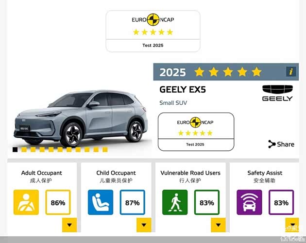 在澳洲新车安全评鉴协会(ANCAP)最新一批新车碰撞测试评定中,吉利银河E5同样以145.52的总分,荣获最高五星安全评级,实现了全球双五星安全认证。