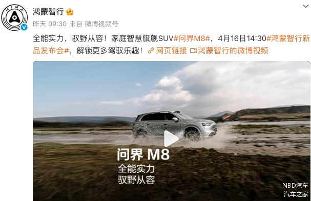 问界M8是问界品牌推出的全新产品,定位为家庭智慧旗舰SUV。3月6日,问界M8正式开启预售,预售价为36.8万元起。4月14日,鸿蒙智行微博发布消息显示,问界M8将于4月16日正式上市。