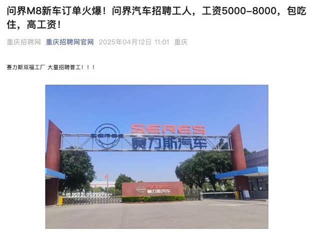 近日,多个社交媒体平台显示,赛力斯正在大量招聘普工。记者翻阅微信公众号为“重庆招聘网官网”发布的招聘信息发现,一条名为“ 问界M8新车订单火爆,问界汽车招聘工人,工资5000元~8000元,包吃包住,高工资”的招聘信息,在20天不到的时间内发布了两次。“我们是赛力斯厂区对外招工的一个合作平台,他们工厂有招工需求就会发在我们这个号上。”一位“重庆招聘网官网”的工作人员告诉记者。