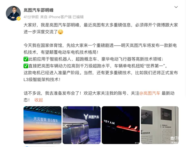 4月15日,岚图汽车CBO、销售公司总经理邵明峰在微博上宣布,今天我在国家体育馆,先给大家来一个重磅剧透——明天岚图汽车将发布一款新电机技术,有望颠覆电动车电机技术格局。