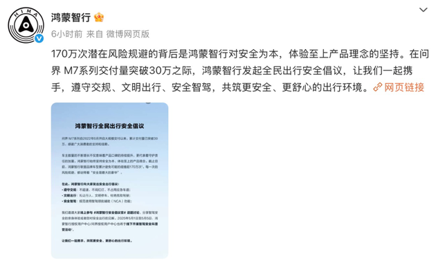 经确认,该品牌实际上为华为鸿蒙智行。4月15日,鸿蒙智行发起“全民出行安全倡议”,并将在5月1日至5日,在线下开展智驾安全科普活动。