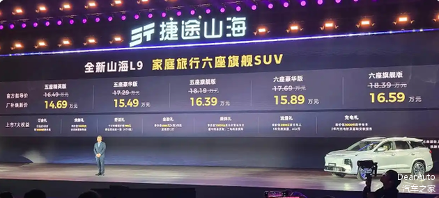 作为改款车型,全新山海L9售价区间为16.49-18.39万元,厂补焕新价为14.69-16.59万元。新车主要对外观和配置进行升级,不仅提供2+2+2独立座椅(6座)布局,还提供5座和7座布局。