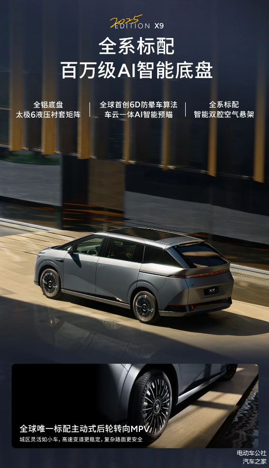 新车全新标配百万级AI智能底盘,全球首创6D防晕车算法、全系标配智能双腔空气悬架,全球唯一标配主动式后轮转向MPV;新车通过C-NCAP五星和C-IASI优秀双认证。