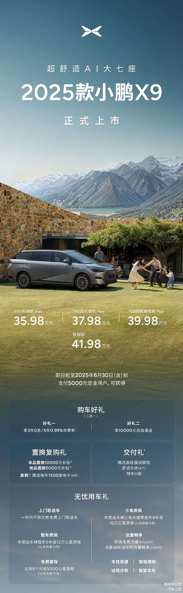 4月15日,2025款 小鹏X9正式上市。新车共推出4款车型,售价35.98-41.98万元,全系全域800V,CLTC工况下最大续航740km。